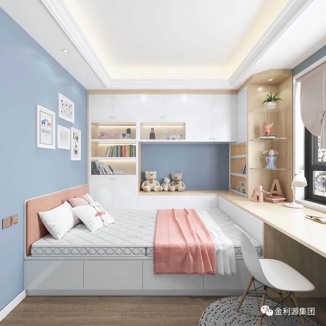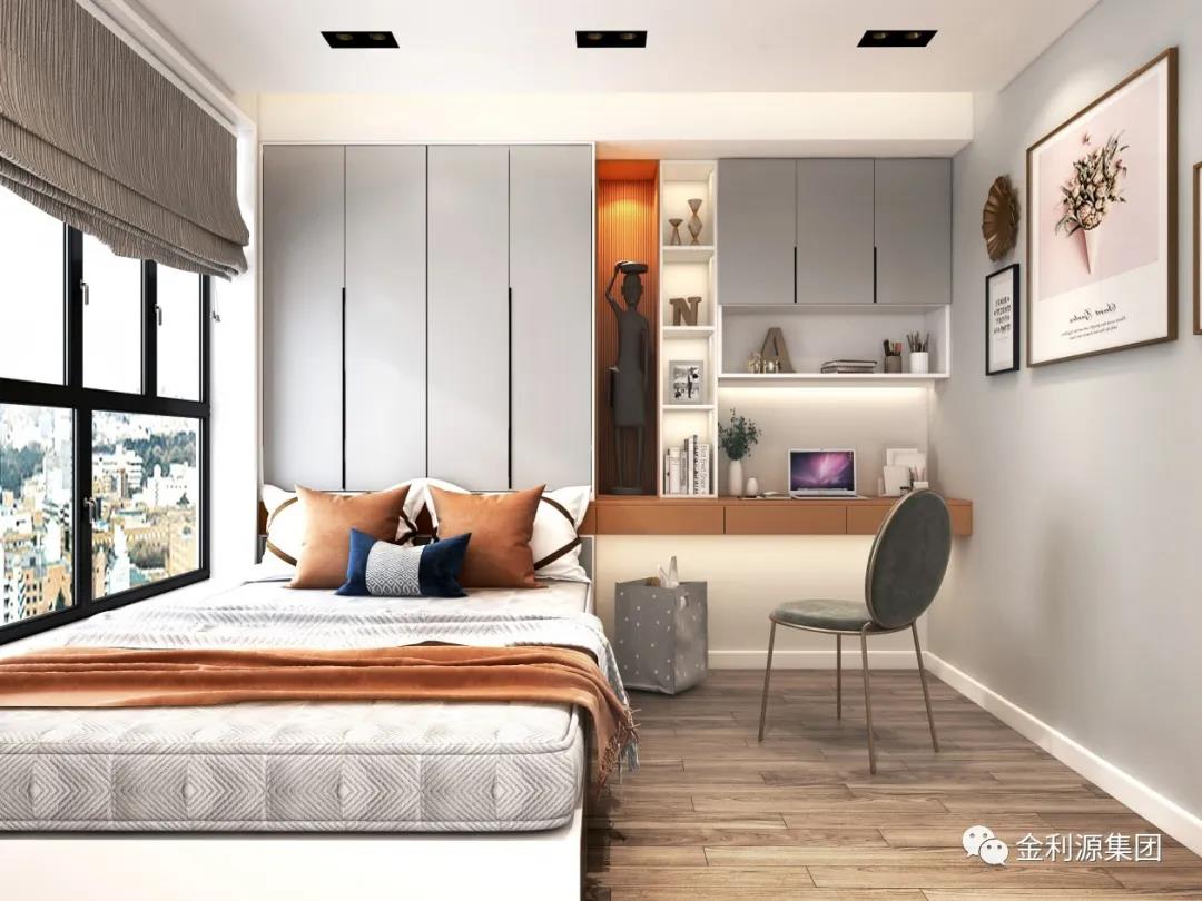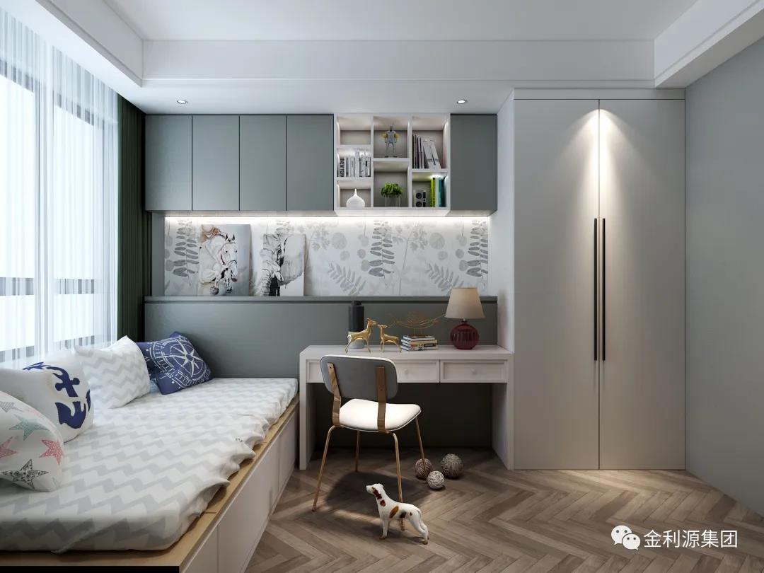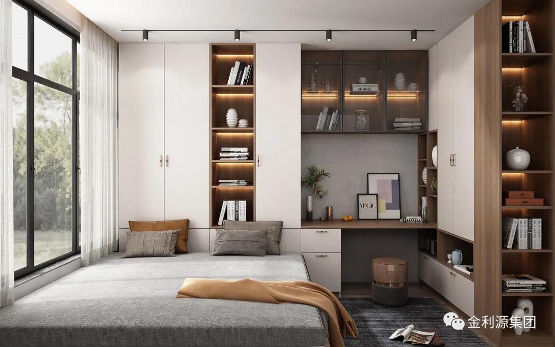 入墙式飘窗柜的设计更是点晴之笔,将梳妆台与书柜衔接,让空间面积并不大的卧室使用起来更方便。