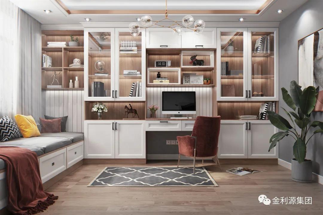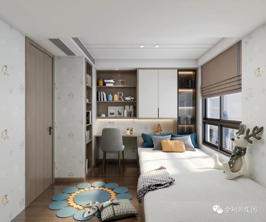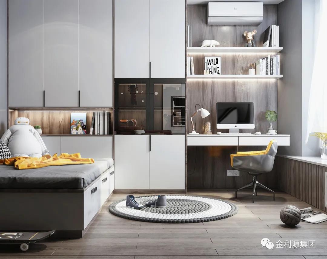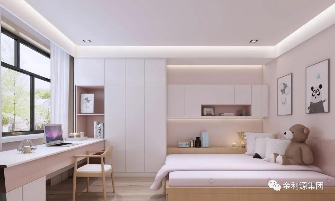 入墙式飘窗柜的设计更是点晴之笔,将梳妆台与书柜衔接,让空间面积并不大的卧室使用起来更方便。